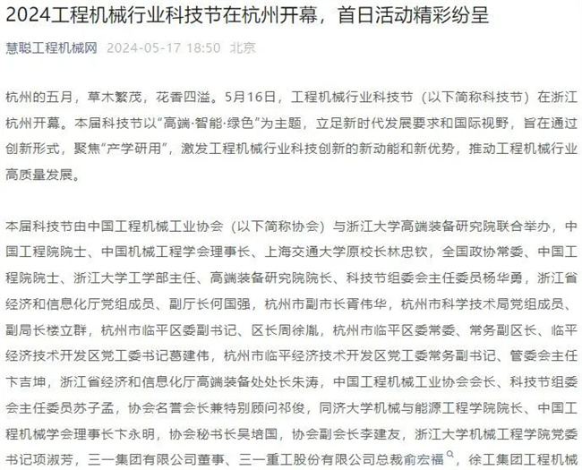 2024年5月16—17日,由半岛娱乐网与浙江大学高端装备研究院联合主办的工程机械行业科技节(以下简称科技节)在杭州成功举办。本届科技节聚焦“高端·智能·绿色”主题,旨在贯彻落实好国家创新驱动发展战略,推动政产学研用深度合作,加快科技成果产业化,提升行业产业链、供应链能力与水平,培育和发展新质生产力,推动行业实现高质量发展。